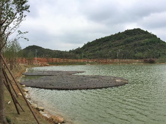 貴安新區(qū)兩湖一河項目浮動濕地分布于北二區(qū)和星月湖二期C區(qū),首件浮動濕地位于月亮湖公園二期北二區(qū),由上下兩部分組成,上部結構采用復合纖維材料具有載體材質的高效能填充物組裝而成,浮動濕地載體上面布置植物種植孔,孔徑9cm;孔深10cm;相鄰孔中心間距19cm,空隙中栽種水生植物,可以使空隙中的水生植物穿透浮動濕地直達到水體,并在載體內部橫向及縱向植根。浮動濕地是項目一個重要的施工環(huán)節(jié),屬于新型環(huán)保設施,零排放、零污染、零消耗,利用水生植物自然凈化水質。