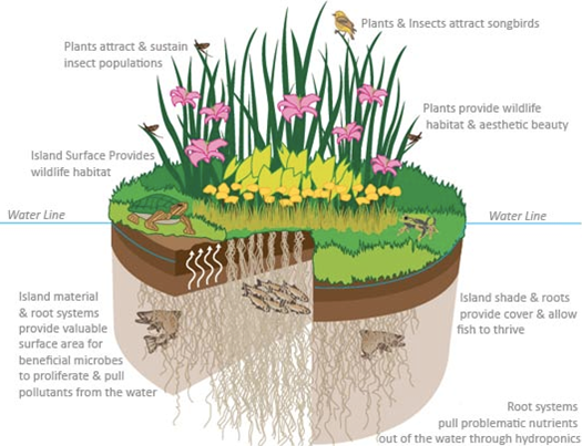 百奧源®浮動(dòng)濕地能夠在不同水體中構(gòu)建適宜的生境平臺(tái),充分恢復(fù)和發(fā)揮水體自身的生態(tài)功能,其主要作用的機(jī)制來源于微生物、植物、水生生物和修復(fù)生態(tài)圈的綜合作用。